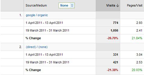 This morning, I was looking at some year on year data for a client, something that I do on a daily basis. So I set my date ranges, and looked down at traffic sources, and realised that the important stat, % change, wasn’t there. Here’s an example.