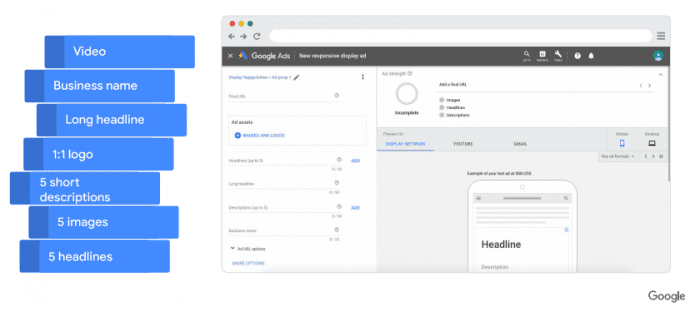 Instead of setting up targeting as you would in a normal display campaign, Google uses signals from existing paid activity to reach new users. You would then upload a selection of headlines, descriptions, logos and images which Google uses to create responsive ads.