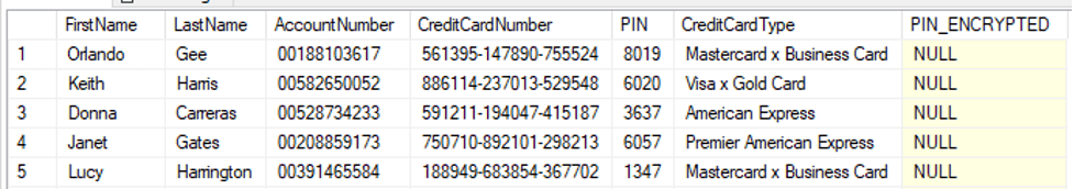 INSERT INTO dbo.CreditCard (FirstName,LastName,AccountNumber,CreditCardNumber,PIN,CreditCardType,PIN_ENCRYPTED)