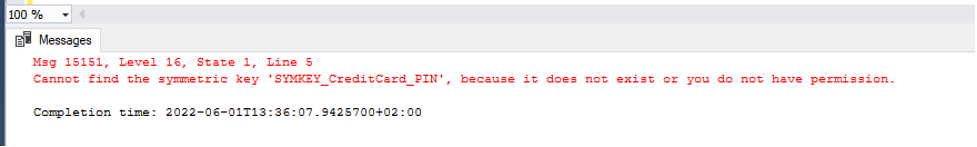 A user with read permission cannot decrypt data using the symmetric key. If a user that doesn’t have required permissions tries to open a symmetric key and then decrypt the data, the output message will say that the symmetric key does not exist, or the user does not have permission to use it (picture below)