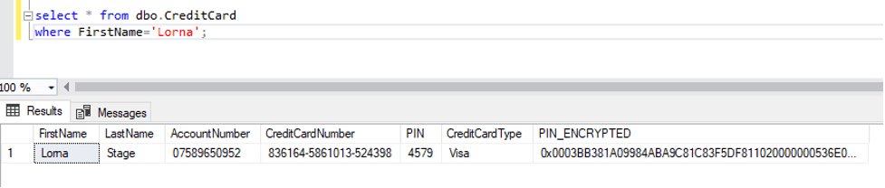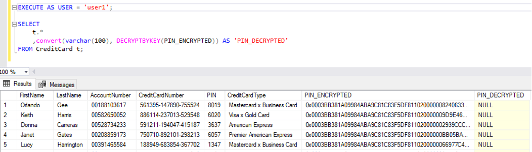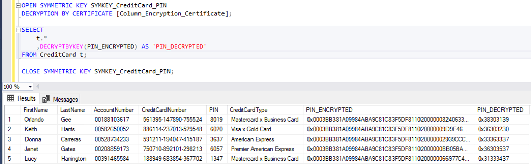 Users that have access to decrypt the data can run special statement that will show them decrypted PIN numbers. PIN_ENCRYPTED is VARBINARY type and it’s shown to us in an unreadable format.