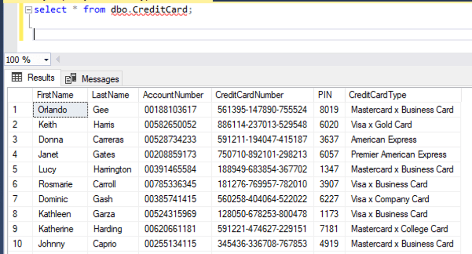 In MSSQL Server we created a table that holds information about credit cards. Inserted data is dummy data. AccountNumber, CreditCardNumber and PIN were generated by random numbers in the excel file and FirstName, LastName and CreditCardType were taken from the Internet.