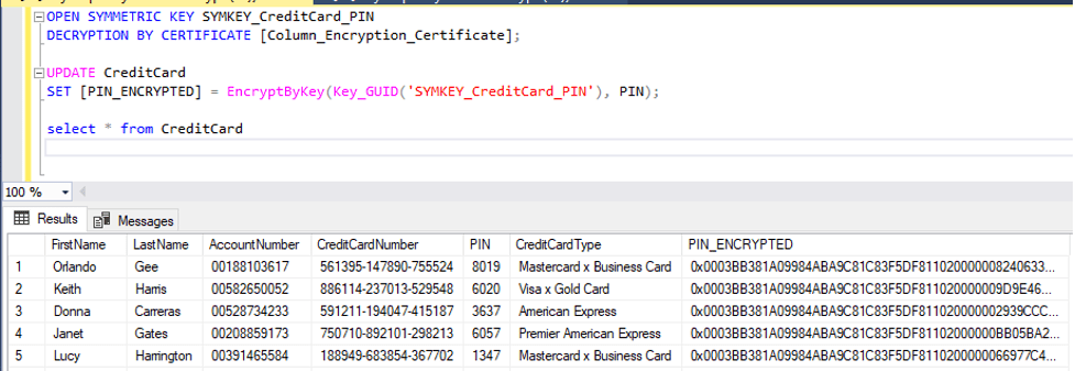 SET [PIN_ENCRYPTED] = EncryptByKey(Key_GUID('SYMKEY_CreditCard_PIN'), PIN);