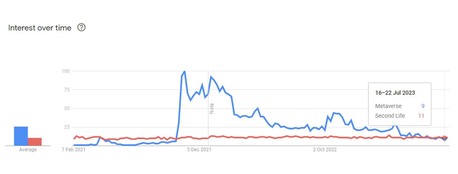 We can certainly see that search interest in the Metaverse has also petered out – actually according to Google trends there were comparatively more searches for Second Life than Metaverse back in July.