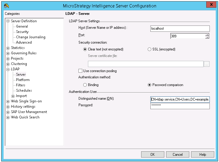 - Security connection: Intelligence Server can connect to the LDAP server either using clear text or by transmitting encrypted information using SSL. For demonstration purposes we’ll use clear text connection.