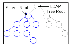 Search root distinguished name (DN): Provide the root DN to establish the directory location from where in the LDAP tree to start any user and group searches. By default, this field is empty. If a root DN is not provided, Intelligence Server searches the entire LDAP tree. You can think of the root DN as the highest level in the LDAP tree where the search can reach. The image below represents the section of the LDAP tree that the search accesses, represented as the distinguished name nodes with solid blue lines. The distinguished name nodes with dashed grey lines are not included in the search since they are not under the search root distinguished name.