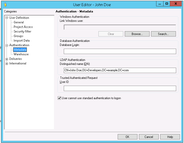- **Distinguished name (DN): **Here we’ll enter the Distinguished Name of John Doe. We got that info directly from Active Directory. If you don’t have access to AD, ask your system administrator to provide the distinguished name to you. You’ll have to do this for all users you want to link with AD.
