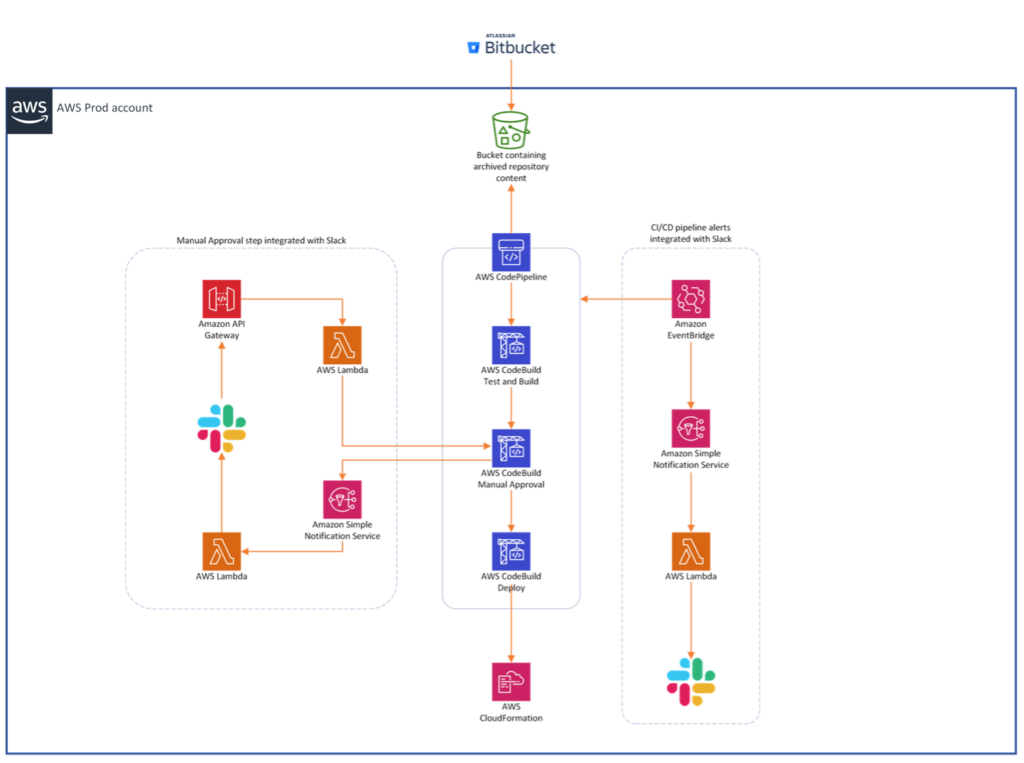 Monitoring improvements were achieved by integrating with Slack. Each pipeline has its own Event Rule that sends failure notifications to a central Event Bus which then triggers a Lambda function. This Lambda function parses CodeBuild execution logs and forms a message containing a code snippet with logs entries which were created at the time of the failure. This function also fetches the name of the project whose CI/CD had failed and the account ID in which the failure had occurred. After forming it, the message is sent via a webhook to a Slack channel intended specifically for CI/CD pipeline failure alerts. All CI/CD pipelines are built by combining AWS CodePipeline, AWS CodeBuild, AWS Lambda, AWS CloudFormation, Amazon Elastic Container Registry, Amazon Simple Notification Service (SNS), Amazon EventBridge, AWS Identity and Access Management (IAM).