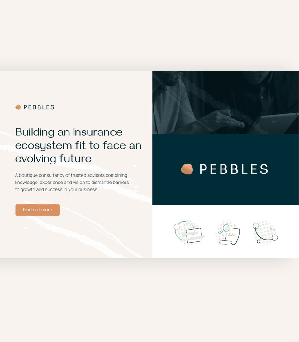 Pebbles, a start-up boutique consultancy in the Insurance space, was looking to create a brand to communicate the story behind their name, their vision and values. We gave them a brand foundation with which to go to market. We crafted a brand that could be built on in the future and translated that into a website design that could be immediately built but left scope for future development.