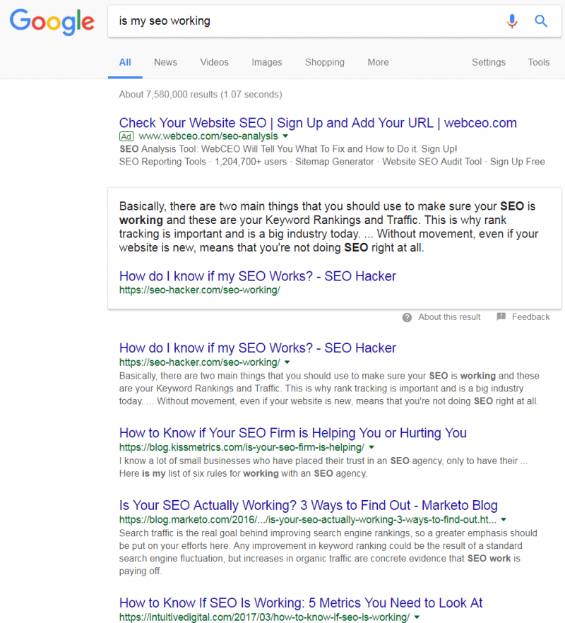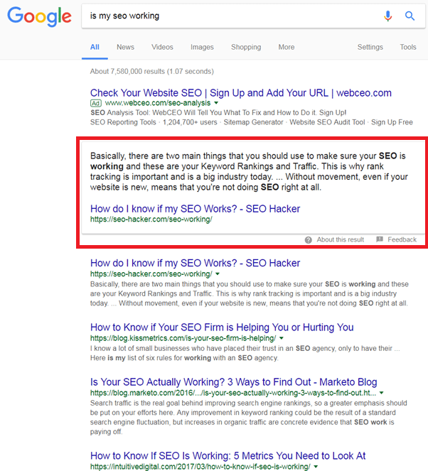The first step here is to identify the kinds of searches that Google is showing Featured Snippets for – those being questions or searches that imply a question. The is my SEO working example above is a good one.