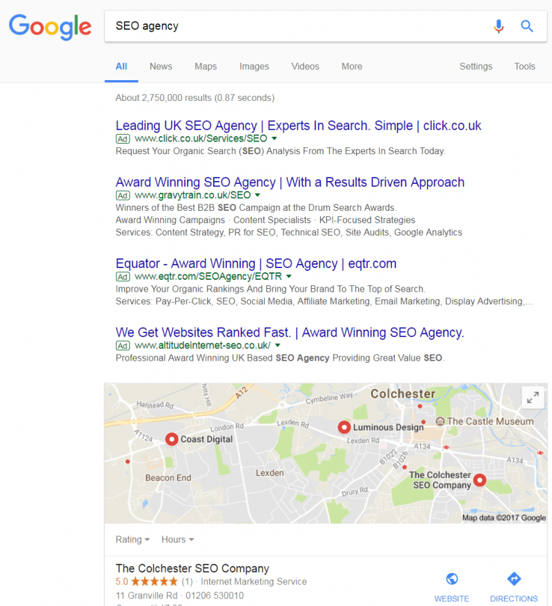 For example, if I make what you might consider a ‘ready to purchase’ style search – for example SEO agency – I get what I would consider a fairly atypical SERP. Here’s what I see ‘above the fold’…