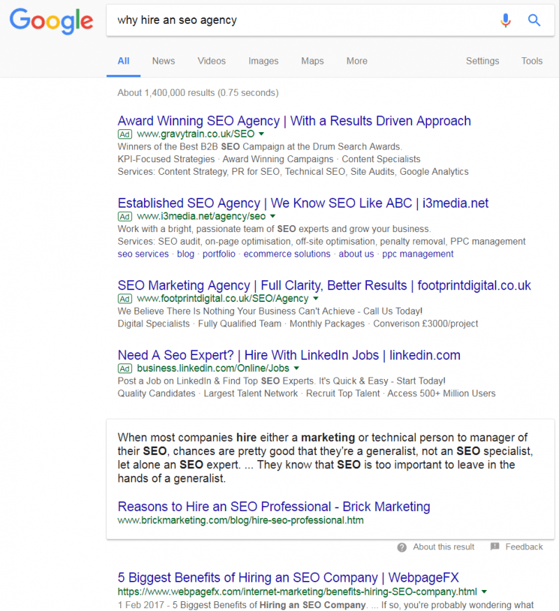But what happens if I try a different kind of search – what about some searches that might occur further back in the decision-making process? For example, why hire an SEO agency and is my SEO working…