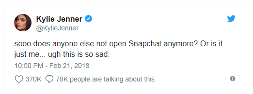 The buzz surrounding Instagram Stories picked up speed when Snapchat released a new interface in February 2018, which caused an overwhelmingly negative response (there was actually a petition with 1.2 million signatures to reverse the redesign). This included negative comments from high profile celebrity influencers, such as Kylie Jenner who tweeted the following: