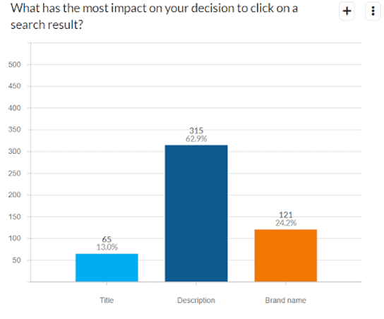 The results of this single question are fairly surprising, and show that (of the participants surveyed) 62.9% of respondents said that the meta description tag is the factor that most influences their decision on a Google search result. In addition, 24.2% said that it’s the brand name, while only 13.0% said meta title tags.