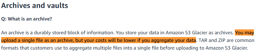he solution, as it is in most cases with AWS, is to follow the best practices and aggregate and compress your files before storing them in Glacier. For the 2nd scenario, the solution is to simply download all the files to an ec2 instance manually, zip them all up, and send them to a glacier vault. Of course, one must not forget that you still must pay for the GET request ($0.0004 per 1000 requests) which would come out to $96, but still significantly cheaper than $12,000. The first scenario, while slightly more complicated, is still very simple to resolve. In our case we decided to use the spare computing resources of one of our EC2 instances and run a bash script which would run once a week, download the files, compress and archive them, and send them to a glacier vault.