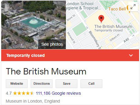 Simply put, having lots of great reviews make Google My Business profiles look amazing, increasing the likelihood of clicks through to your site. Take the British Museum for example, the number of positive Google Reviews on this profile suggests to me that it’s an awesome museum to visit!