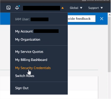 Next, once the bucket is created, we need to pull the information to access it. In the upper right corner click on your user profile and go to My Security Credentials as shown below.