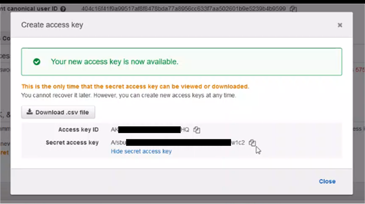 From there, copy your Access Key ID and Secret Access Key to a safe place as these will be needed for the nzrestore application to successfully connect to your S3 bucket.