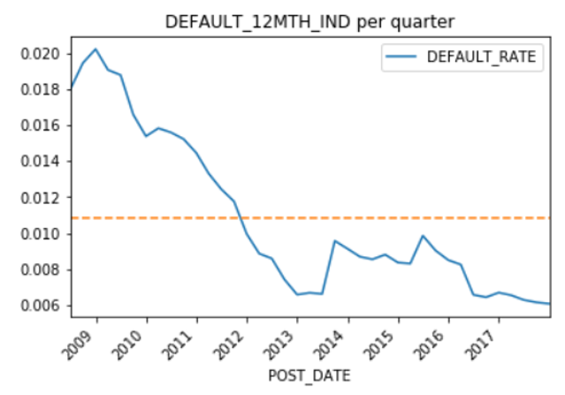 This solution was focused on determining how transactional banking information could be used to predict loan account default. Bank account transaction data provides insight into customer behavior and what patterns led to loan default. The data consisted of account information including types, sources, locations, and amounts of transactions. Additionally, account balance, and age and type of account were included. Combining this information with age and type of loan provided a rich feature set to work from. One of the first issues to tackle was the large imbalance between the default and non-default classifications. As seen in the graph below, the default rate of accounts is 2% or less per quarter. Without additional sampling methods, this imbalance would cause the model almost exclusively learn the patterns of non-default accounts and perform poorly positive default accounts.