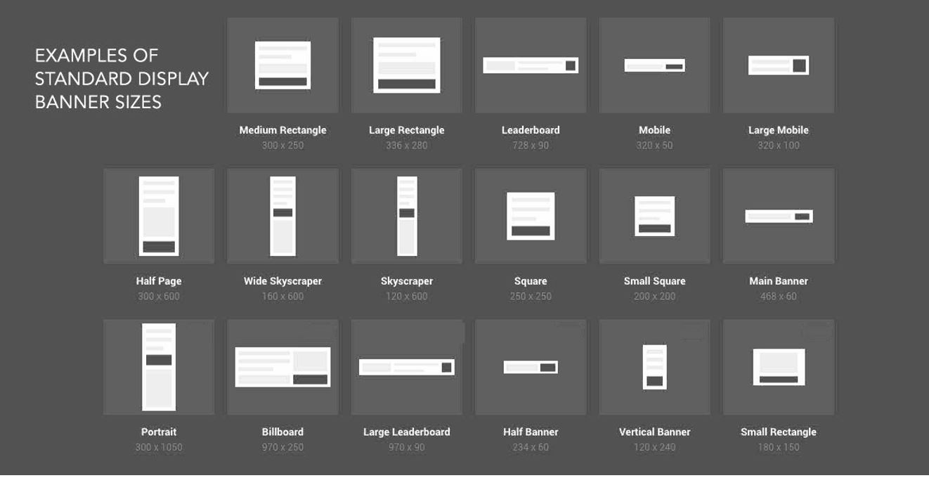 Because sites worldwide will offer different placements, to maximise your reach you will want to use as many sizes as possible. Below are examples of standard banner sizes, we recommend that you use 160×600, 300×250, 728×90 and 300×250 as a minimum – because these are the most commonly accepted sizes amongst publishers.