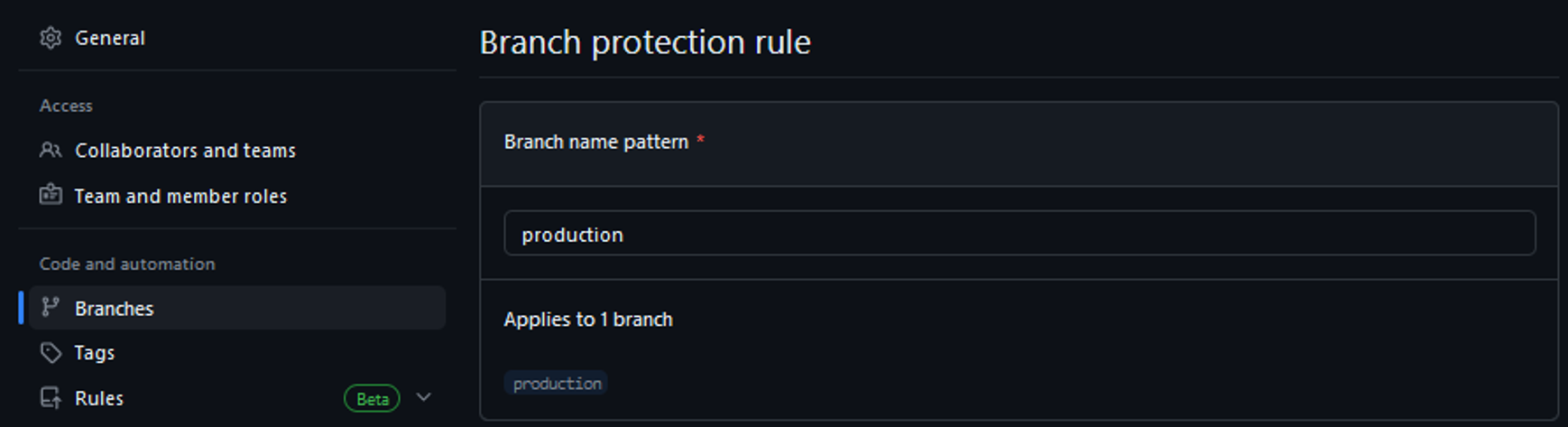 If we have a branch named ‘production’ and we want to protect it by using Branch Protection Rules, we need to navigate to Settings and click on Branches. Click ‘Add rule’ and make sure that the rule name is the same as the name of the branch, otherwise the rule will not apply to the branch. In this case, we would create a rule called ‘production’.