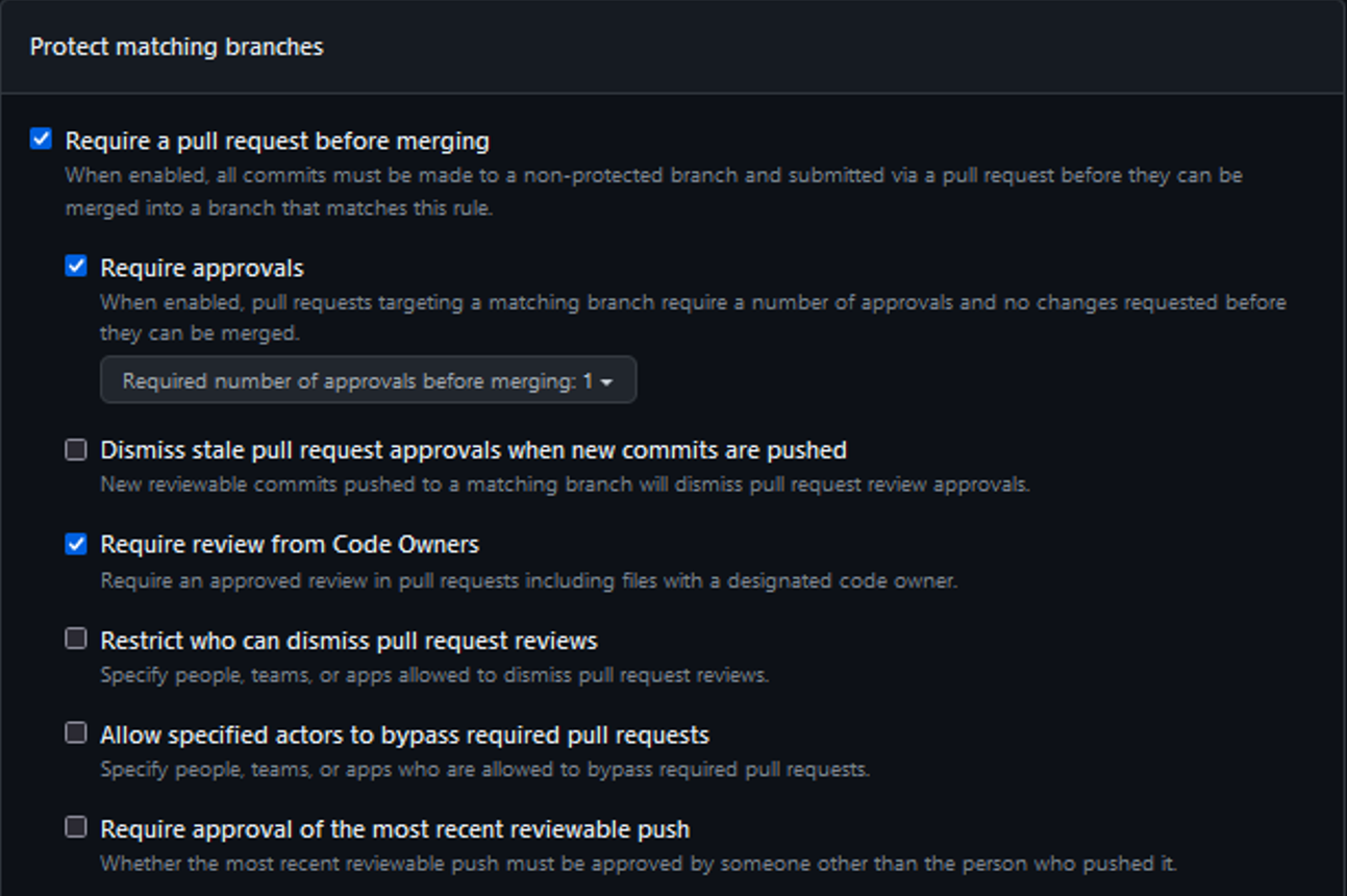 We can also specify how many approvals we require before the pull request can be valid. This will force responsible users (Codeowners) to check the code before it is released into the environment.