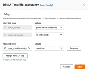 Once you have imported a Data Product to the Governance Account, it is important that you use LF-Tags to mark the Data Confidentiality of each column. In this way you guarantee fine-grained access control over each data-product and Consumer Admins can control which of their user groups can see only Public Data and those that can see Sensitive data.