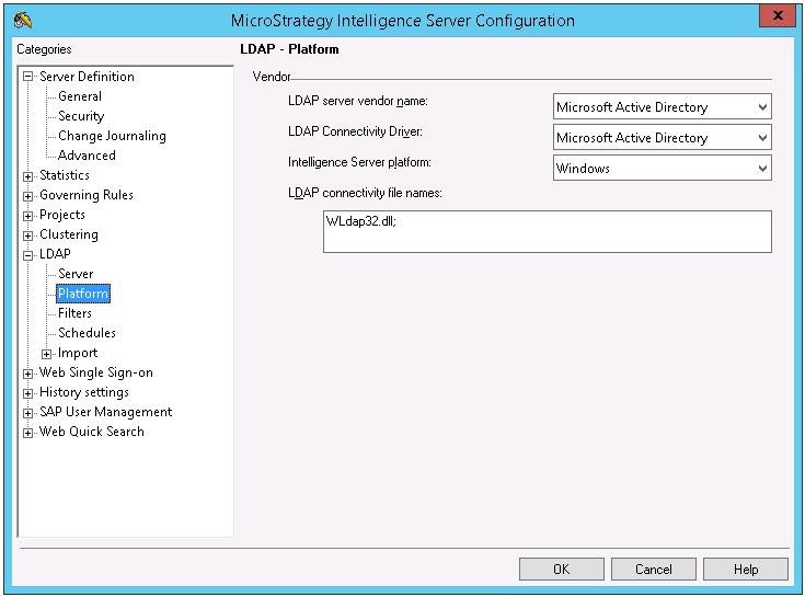 This part is pretty straightforward and self-explanatory. LDAP server vendor name is Microsoft Active Directory, the same is true for LDAP Connectivity Driver. The OS where Intelligence Server is installed is Windows Server 2012, so we pick Windows. LDAP connectivity file names area is automatically populated with WLdap32.dll.