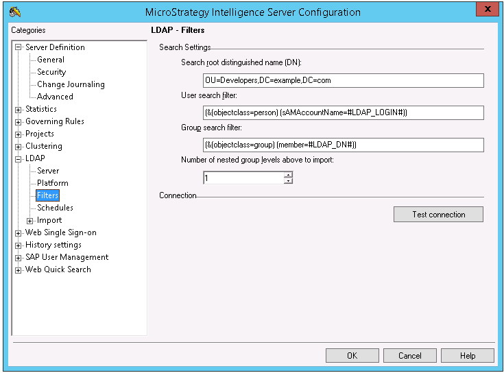 - Security connection: Intelligence Server can connect to the LDAP server either using clear text or by transmitting encrypted information using SSL. For demonstration purposes we’ll use clear text connection.