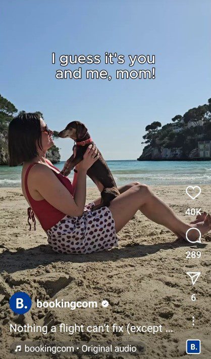 Online travel site Booking.com tapped into our collective adoration of cute pups and the relatability of looking for love with an Instagram Reel about a lady and her fur baby.